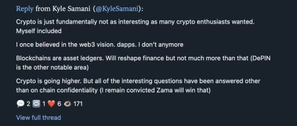 他说:「加密货币本质上并没有许多加密爱好者所期望的那么有趣。我曾经相信 Web3 的愿景,相信 dApps。现在我不信了。区块链主要是资产账本,虽然能重塑金融,但在其他领域的潜力有限。」