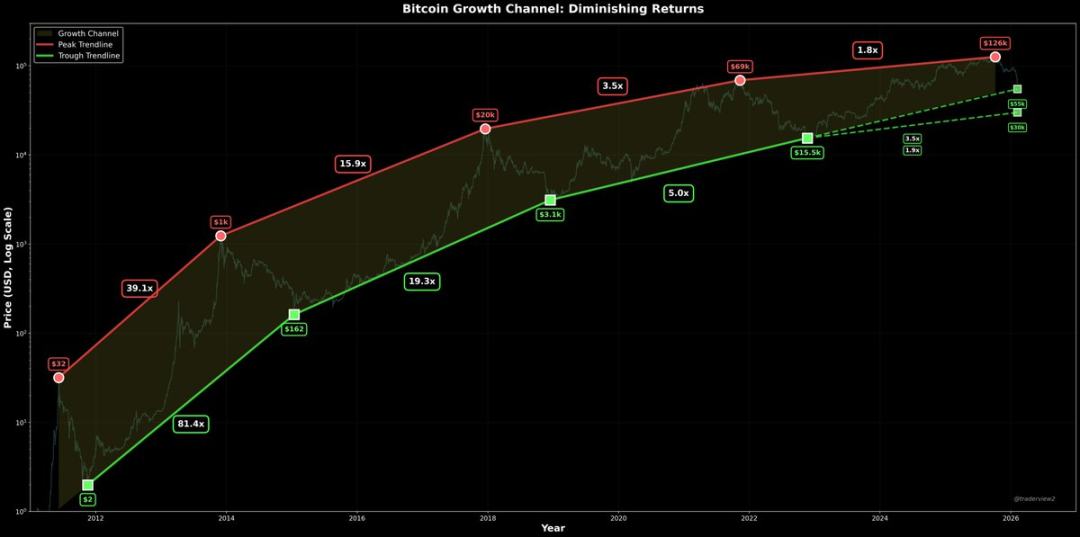 比特币上周价格一度触及 6 万美元。在收益递减模型下,这绝不是简单的噪音。市场正在触碰整个四年周期与对数增长框架中最脆弱的环节。