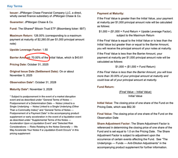 接着是第三环。既然我们理解了 IBIT 在广泛去杠杆中被抛售的机制,那是什么在加速下跌呢?一个可能的「助燃剂」是结构性产品。虽然我认为结构性产品市场规模不足以单独引发抛售,但在一切条件异常且完美叠加、超出任何风险模型预测的情况下,它完全可能成为引发连锁清算的导火索。