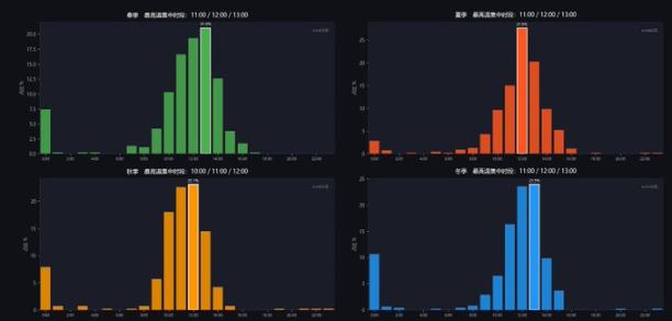 夏季 12:00 的集中度最高,单个小时占全季的 27.6%。