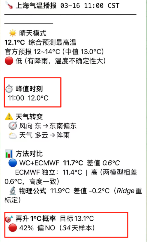 到了上午 11 点,系统推送了升温期的实时报告。当时实测最高温已经到了 12°C,+1°C 概率评分给出结果:今天再涨 1°C 的概率是 42%,偏向不会再升温。